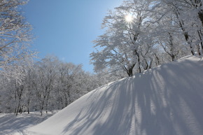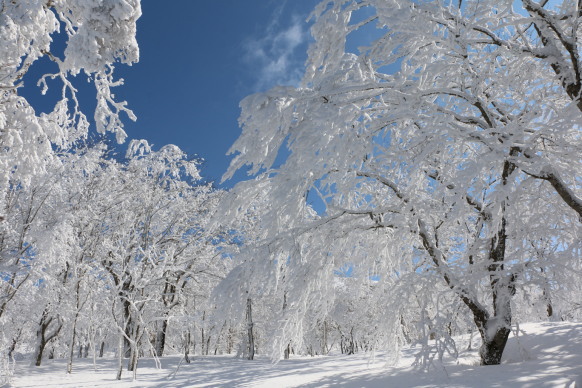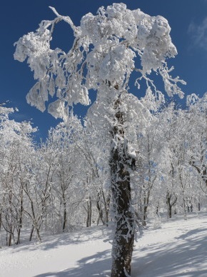 | 木々には霧氷なのか着雪なのか? | 延々と続く単調な登り | ゲレンデ上部に到着しました |