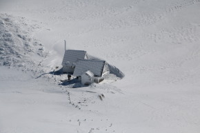 | 三ツ石山の山頂部を眺望する・・・下の方に2名で登っているのが見えます | 三ツ石山荘↑/入口は除雪されています↓ | |
