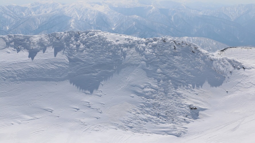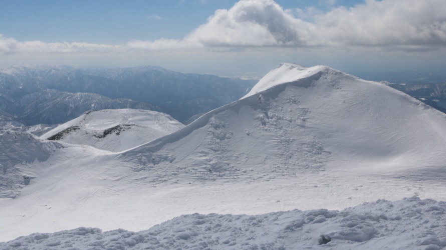 | 大きく迂回して雪庇の上に出ました・・・乳頭山とその奥に秋田駒ヶ岳の姿が | ||