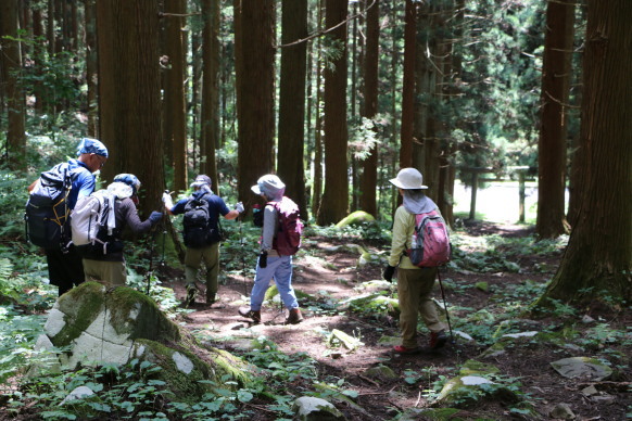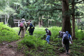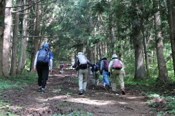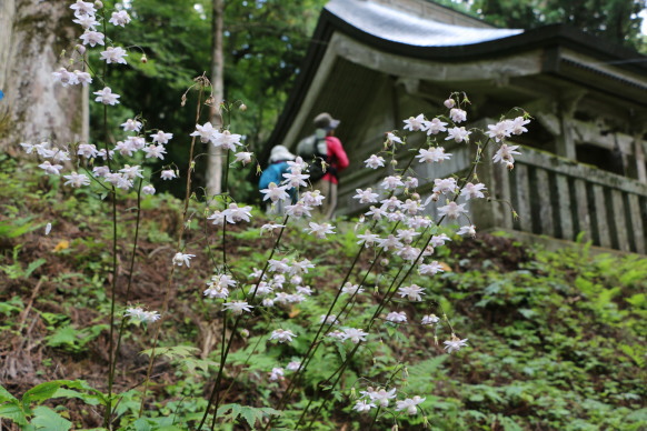 2025年8月18日(月) 参加者:8名 高松公園6:00-盛岡南IC=東北HW=水沢IC-R4-R343-参道口駐車場8:30-出発8:40~室根神社10:20~室根山山頂10:50-(昼食)-下山11:20~室根神社11:35~参道口駐車場・着12:25 今回の室根山は、2022年8月の同時期に行われたハイキング企画で出合った、森の妖精のようなレンゲショウマに再び出合う事を目的に企画されました。 連日の暑さも少し落ち着いてきたものの、この日の最高気温は再び35℃の予報となっています。山頂まで無事に登り切れるかチョット不安になります。 室根山の山頂への登山道は、室根神社への参道を利用している為、室根神社参道入口から室根神社まで2.7km、山頂までは3,5kmですが殆んど一直線で思ったよりも急登続きです。しかし、参道ならではの大木の杉木立で覆われている為、直射日光が遮られてそれ程暑さを感じません。 そして参道口から90分程で進んだところで、今回の目的のレンゲショウマの群落が待っていました。・・・【工藤 記】 |