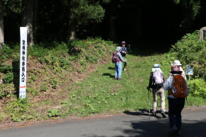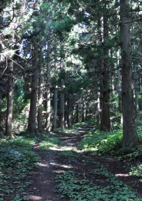 もう直ぐ2回目の道路交差です | 広い参道は、杉の大木で日除けされ暑さも凌げます | |