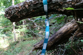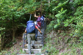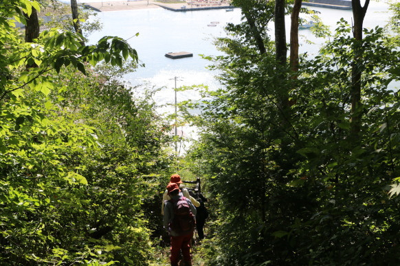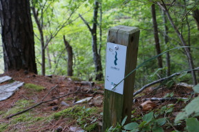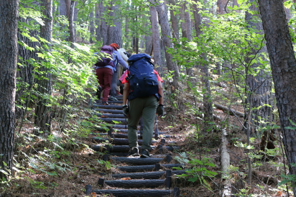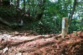 | 潮風トレイルのリボンが↑/トレイルの標柱↓ | 延々と続く階段の始まり | |