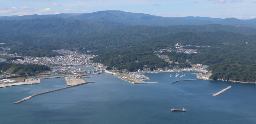 | 宮古湾を一望・・・閉伊川の河口と右側が宮古漁港・・・! | ||