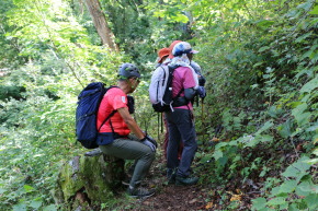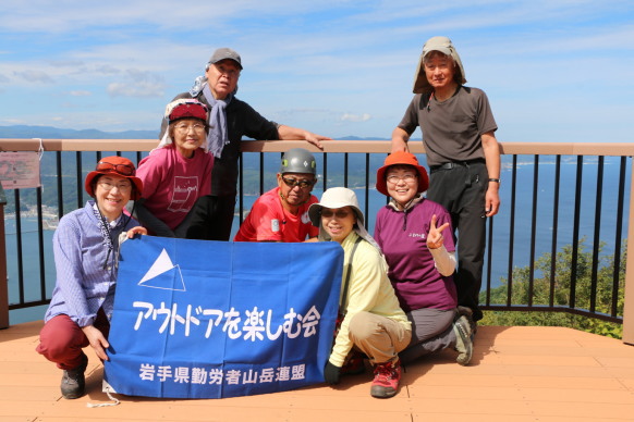 | 2025年9月23日(火) 参加者:7名 高松公園6:30-(道の駅・やまびこ館)-白浜着8:20-登山口出発8:35~林道・分岐11:05~月山・山頂11:30-(昼食)-下山12:05~登山口着14:15 当初の計画では9月20日(土)でしたが、天気予報では雨という事だったので、祝日の23日に日程変更しての山行となりました。 月山の山頂には、テレビ局の放送用アンテナが設置されている為、車道が通じており展望を楽しむだけなら車でも簡単に訪れる事が可能です。 今回のコースは白浜漁港の登山口から、みちのく潮風トレイルのコースにもなっているルートを登ります。潮風トレイルの案内標識に沿って進むと、なぜか極端に低い神社の鳥居がありました。何か意味があるのでしょうか? 登山道には、倒木が道を塞いでいる場所もありましたが無事に通過して進みます。しかし1時間ほど進んだところで、まさかの道迷いに遭遇です。登山道が分岐しているように見えた所を、海側の見晴らしの良い方向に進んでしまい、気が付いたら道路が消えていました。 本来そのような場合には、間違った分岐の位置まで引返すのが鉄則ですが、YAMAPアプリで確認しながら急登を登り、正規の登山道に戻る事が出来ました。 コースの途中からは、整備された階段が11ヵ所ほどあり思った以上に体力を消耗します。途中の道迷いのロスタイムもあり、予定より30分程遅れで山頂に到着です。 山頂の先にある展望台からは、宮古湾の奥に早池峰山と薬師岳、白い岩肌と松の緑が映える浄土ヶ浜、重茂半島と沖を往く貨物船等、天候にも恵まれ眺望を楽しむ事が出来ました。・・・【工藤 記】 |