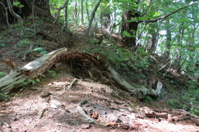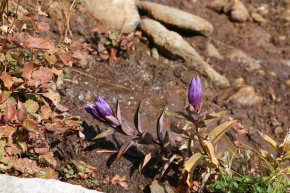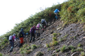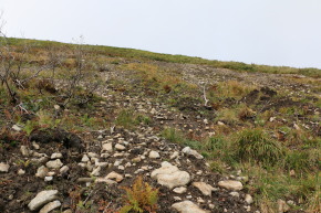 | 源太ヶ岳への登り・・・登山道が崩落し足場が悪いです | 崩落した斜面↑/ザレ場に咲くリンドウ | |