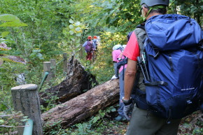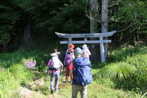 | 階段の先に神社がありました | 倒木を乗り越えて進みます | 小休憩です |