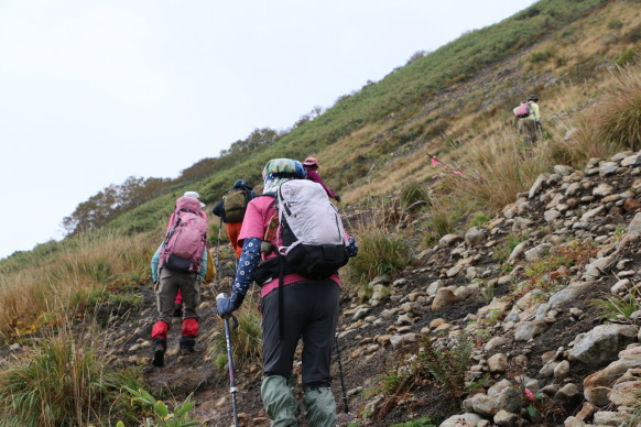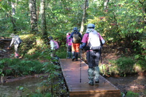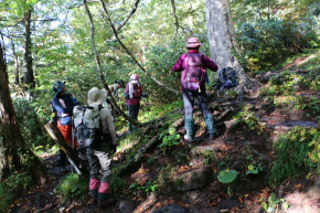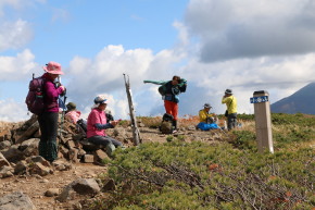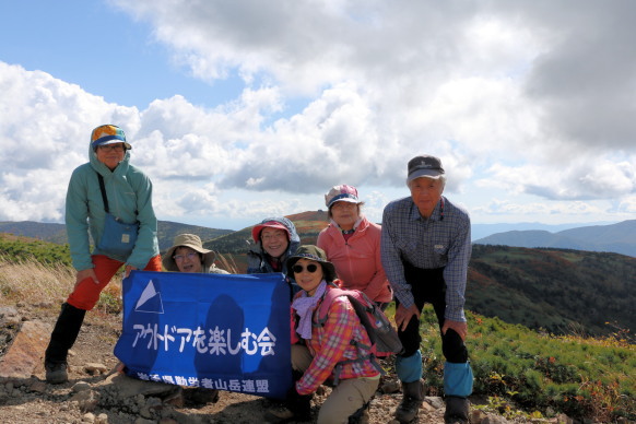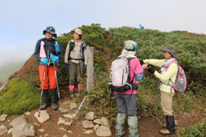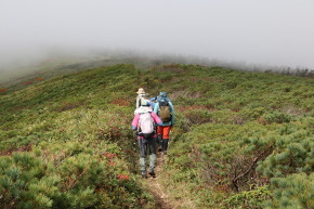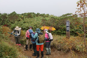 | 2025年9月6日(土) 参加者:6名 小鹿公園6:00-河原坊7:20-出発7:35~小田越登山口-出発8:20~尾根10:20~山頂10:50-(昼食)-下山11:20~小田越登山口13:00~河原坊着13:45 前日の雨で心配しましたが、朝から晴れてくれてホッとしました。早池峰山同様、駐車場から登山口まで40~50分のロード歩きと言う試練が待っていますが、皆さんそれぞれ楽しく会話をしながら歩きました。 登山口の簡易トイレを使うとトイレットペーパーホルダーから大きな蛾が2頭飛び出してきて、おもはず『ギャー』と大きな声を出してしまった。2週間前に早池峰山に来た時も出てきたのです。『なんで私の時に毎回出るー!』。 登り口の木道は雨のせいで、どこに足を置いてもズル、ヌルと滑る。慎重に足を運びながら滑らないように歩く。そうこうしているうちに樹林帯の登りになり、今日のメンバー6名中3名は薬師岳が初めてと言うことで【ヒカリゴケ】を見ることを楽しみにしていた。トップのIさんの『これ、ヒカリゴケ!!』の声に次々と岩の下を覗き込む。蛍のような光から食パンサイズの大きさまで。 ヒカリゴケが見られなくなると視界が開け、早池峰山も見えてくる。尾根まで出ると、イワヒゲやイワウメの葉っぱや咲き終わりの花が見られるフラワーロード。これらの花が旬の時に来たいものです。早池峰山の山頂は雲に隠れていましたが、360度の眺望を楽しみました。・・・【谷藤 記】 |