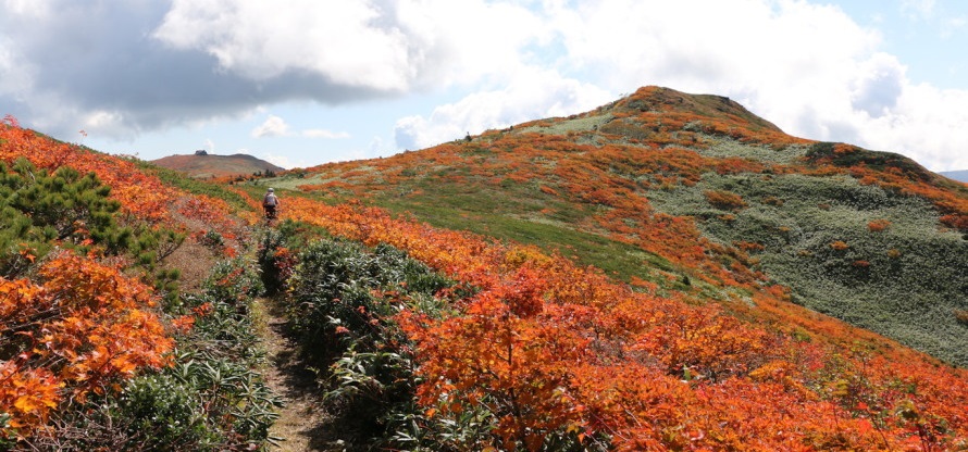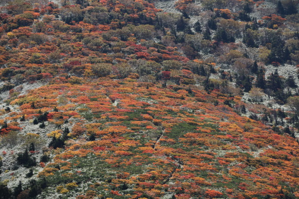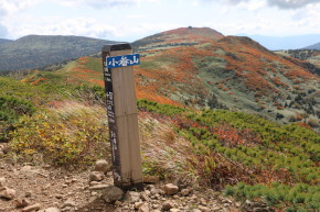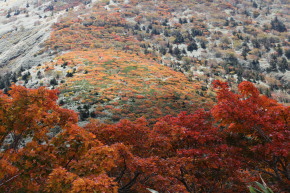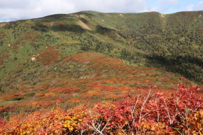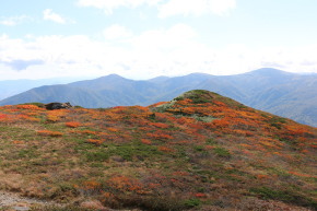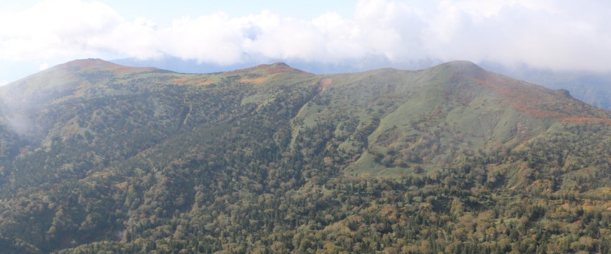 | 小畚山~覘標ノ台~三ツ石山と続く稜線上は赤く色付いています | ||