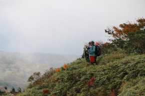 | 2025年10月2日(木) 参加者:6名 小鹿公園5:00-松川駐車場6:00-出発6:20~源太ケ岳登山口6:30~水場7:50~源太岳分岐8:30~大深岳9:40~小畚山10:55-(昼食)-出発11:25~覘標ノ台11:50~三ツ石山・山頂12:35~三ツ石山荘13:20~松川登山口着15:40 まだ夜も明けきらぬ早朝5時、集合場所の小鹿公園には本日の参加メンバーが既に集まっていました。前日からの雨が降りやまず、お互い仁「どうするの?」と声が出てしまいます。家を出る時に確認した天気予報では、あと1~2時間で天気が回復し晴れ間が出るような予報でした。 折角準備して集まった事だし、天気も回復に向かっている予報なので登山口まで行ってみて判断する事にしようという事になりました。登山口の松川温泉に向けて車を走らせて30分位すると、徐々に雨も小降りになり空も明るんできました。登山口の松川温泉に到着する頃には、雲間から青空も覗ける天気に回復し、これなら山行実施しても大丈夫そうです。 源太岳登山口から源太ケ岳~大深岳~小畚山~三ツ石山と周回し、松川登山口へと下山する今回のコースは、稜線上に赤い絨毯を敷いたような紅葉の絶景ポイントが次々と現れて思わず歓声があがります。この日は早朝に雨が降っていた為か、紅葉最盛期にしては人出もそれ程多くは無く登山道での渋滞等も無く助かりました。・・・【工藤 記】 |