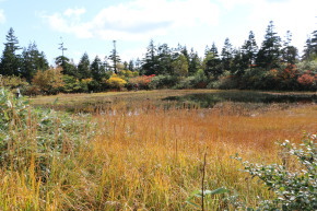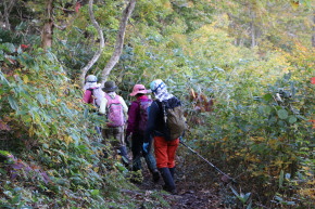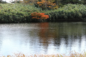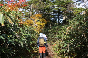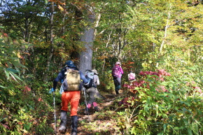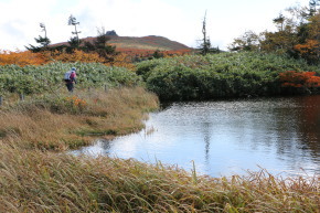 | 今回の最終目的地、三ツ石山へ向けて進みます | 三ッ沼の岸辺も色付いていました | |